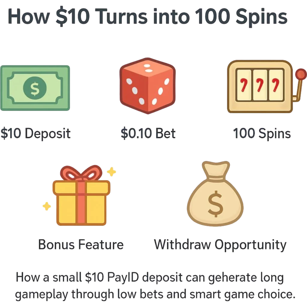 This is where many players misunderstand the power of a $10 deposit casino. At $0.10 per spin on low volatility pokies, a $10 balance gives you 80–120 spins. That’s often 1